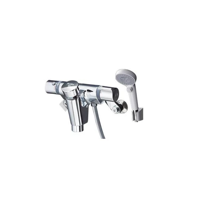 TOTOのTMF49AY2は、自閉式壁付サーモスタット混合水栓で、主に公共施設や多人数が利用する浴室に適したモデルです。レバーまたは押しボタンを押すと適量の湯が自動的に供給され、使用後は自動で止まる仕組みとなっており、湯の無駄遣いを減らし、水道料金や燃料代の節約に貢献します。シャワーヘッドはコンフォートウエーブクリックタイプで、樹脂製のホース(シルバー)と1.6mの長さを持ち、手元一時止水機能も備えています。スパウトの長さは26mmで、一般地用の仕様となっている水栓金具です。